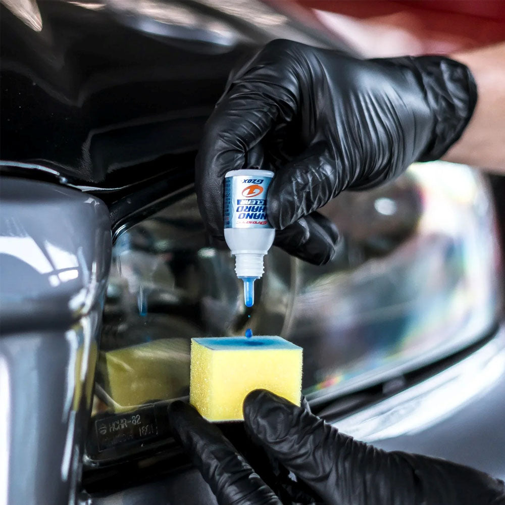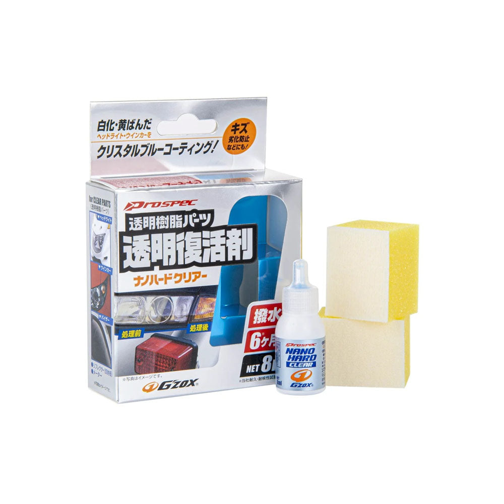 This product restores and protects transparent plastic parts that have faded or yellowed. It can be used on any transparent or translucent unpainted plastic parts, such as light lenses, window deflectors, and translucent trim. A beautiful thin film of Crystal Blue glass coating brings back the clarity of plastic parts, and counteracts yellowing due to age. Unlike one-off quick detailing agents, such as those containing silicone oil, Nano Hard Clear creates a layer of glass on the surface of the plastic, which can improve looks and add protection for over 6 months.