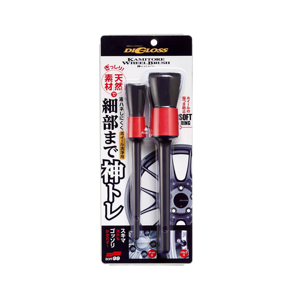 Brushes designed for cleaning narrow and awkward parts of wheels, such as nut holes and around valves. Brush tip made from pig hair. Unlike artificial fibres, pig hair has excellent balance between liquid retention and spreading. Grip made from polypropylene.