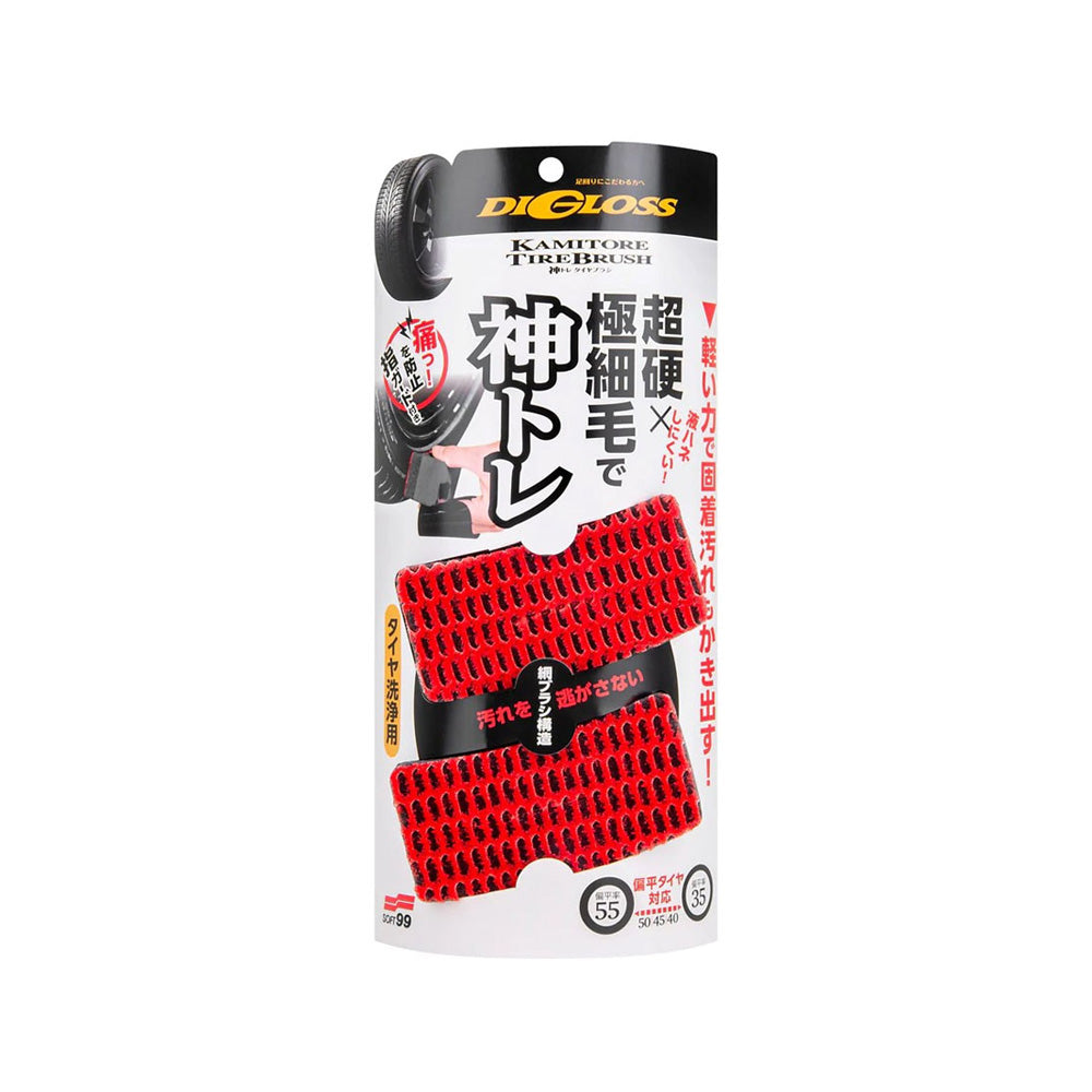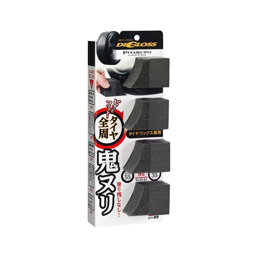 Note: To avoid slinging onto the body etc., do not drive until fully dry. Depending on the condition of the tyre, some unevenness may occur. In that event, allow to dry, and apply more liquid to create an even appearance. DiGloss Pitasupo Tire Sponge is also available for purchase separately. To increase gloss, polish gently with a cloth after drying.
