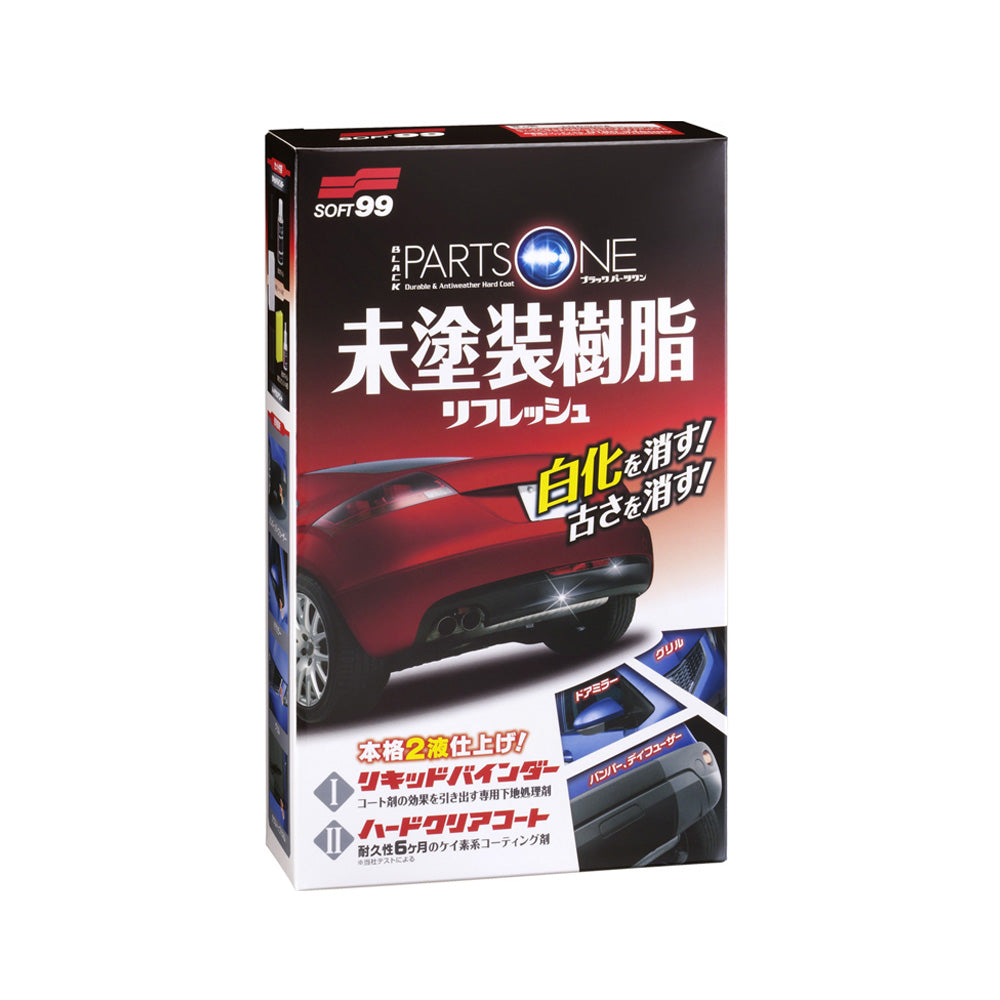 Restoration for unpainted resin parts such as a bumper or around wipers. Included 'Liquid Binder' removes dirt marks from the surface of resin parts, and 'Hard Clear Coat', creating a Silicon-based thick hard film coating.